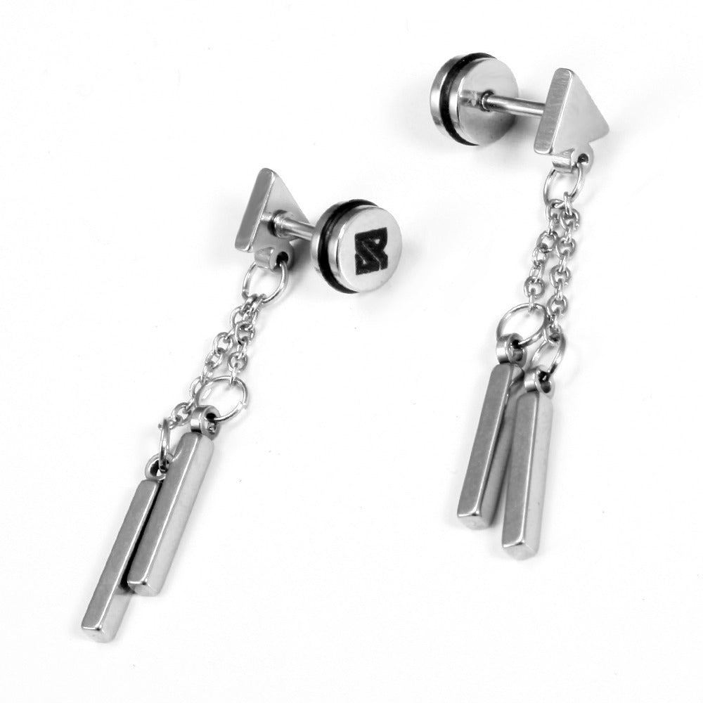 A set of modern earrings, adorned with an angular design and cascading detail, available in multiple colors.